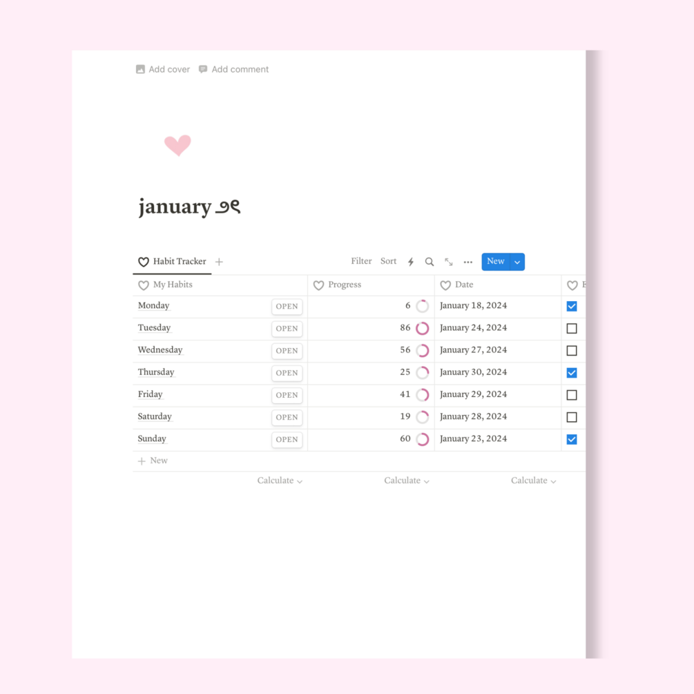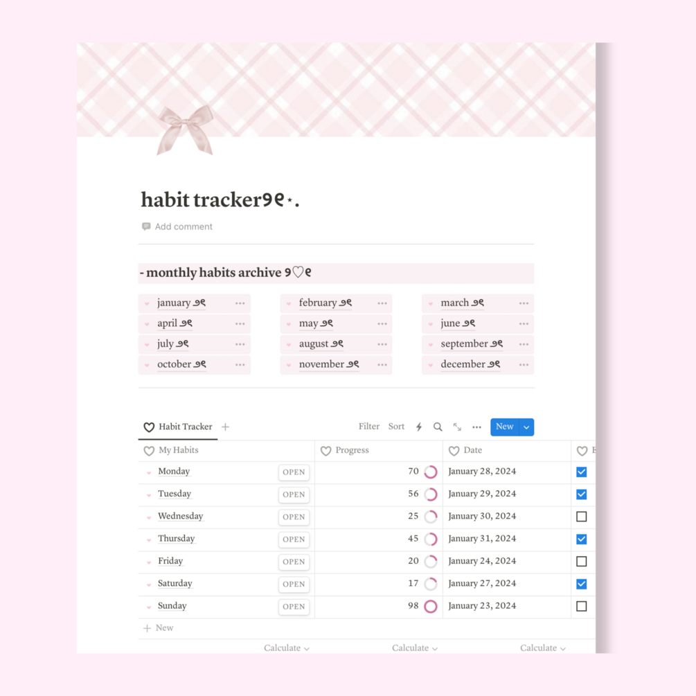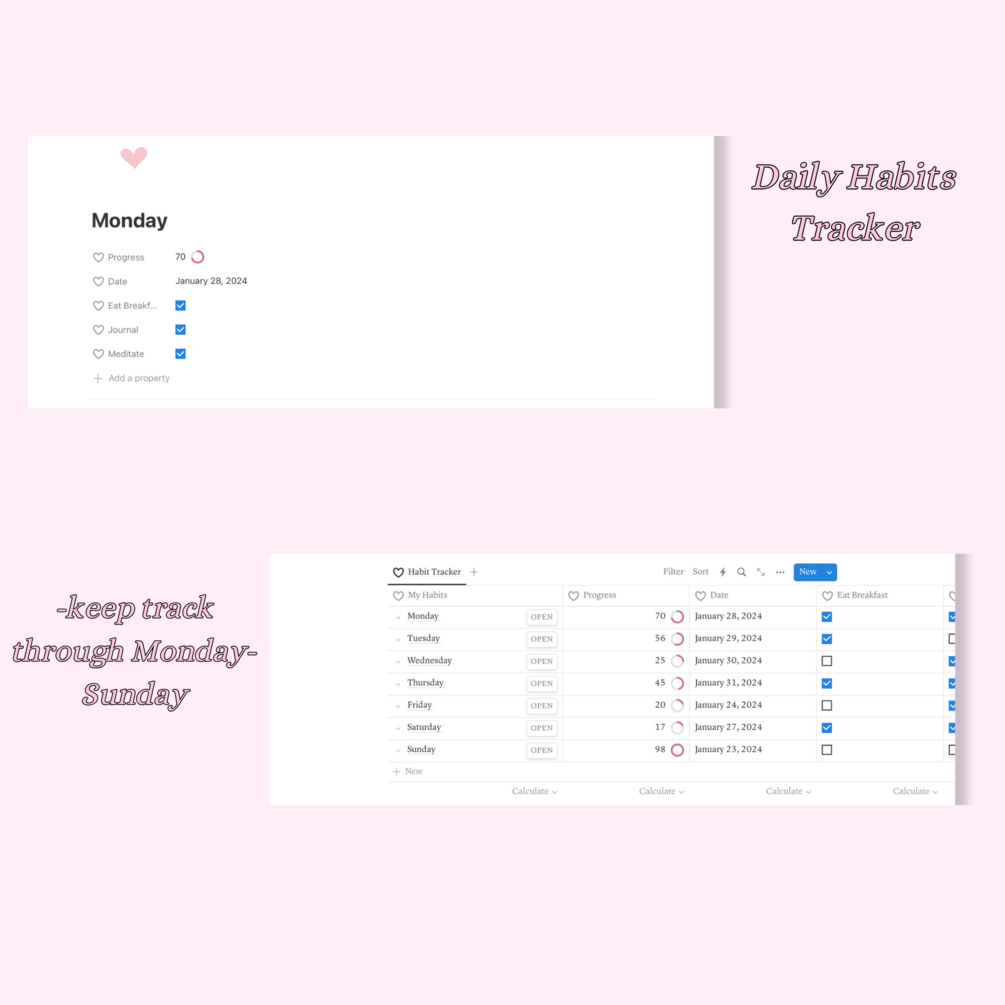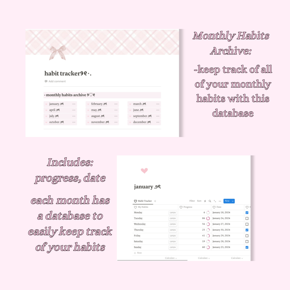 ♡ Looking to stay on top of your daily and monthly habits? Look no further than this Notion habit tracker template! This template is perfect for keeping track of your daily and monthly habits, from drinking enough water to getting enough exercise. With a simple pink design, this habit tracker is easy to use and will help you stay on track with your goals.